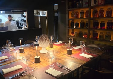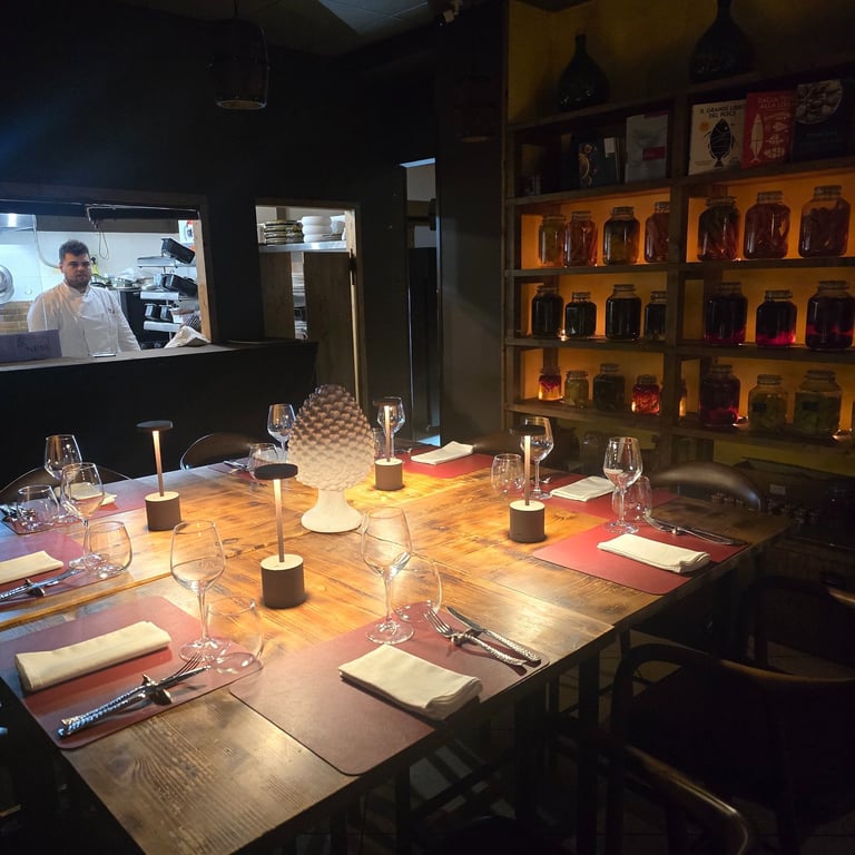 Di giorna una tipica bottega reggina con pranzi di lavoro veloci la sera lo stesso ambiente si trasforma e prende vita per amplificare l'esperienza e stare a contatto con la nostra cucina a vista e con tutto il team. Un esperienza autentica dove vivere a pieno le idee dello chef e la nostra filosofia