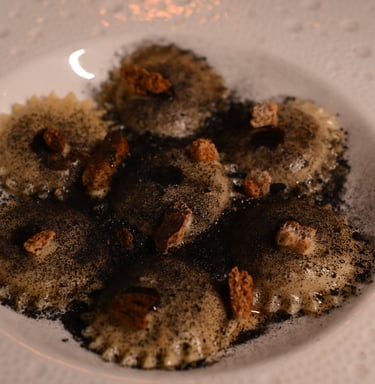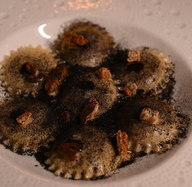 Ripieno di ricciola, con crema di cipolla fermentata, brodo di pesce e polvere di alga nori
