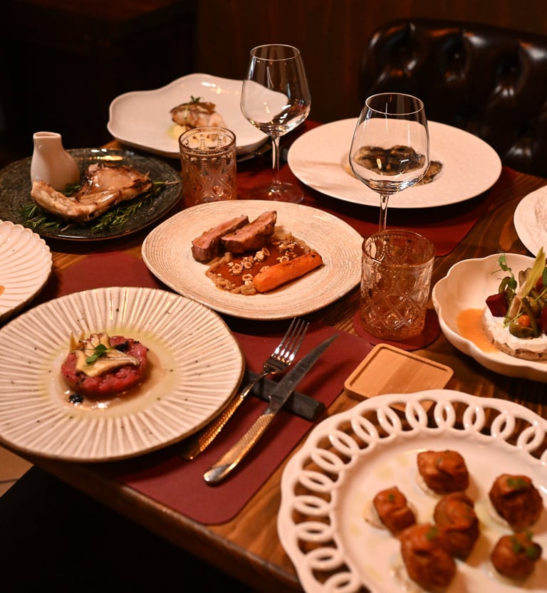 Manzo battuto al coltello, crema di castagne, funghi di stagione e olive disidratate