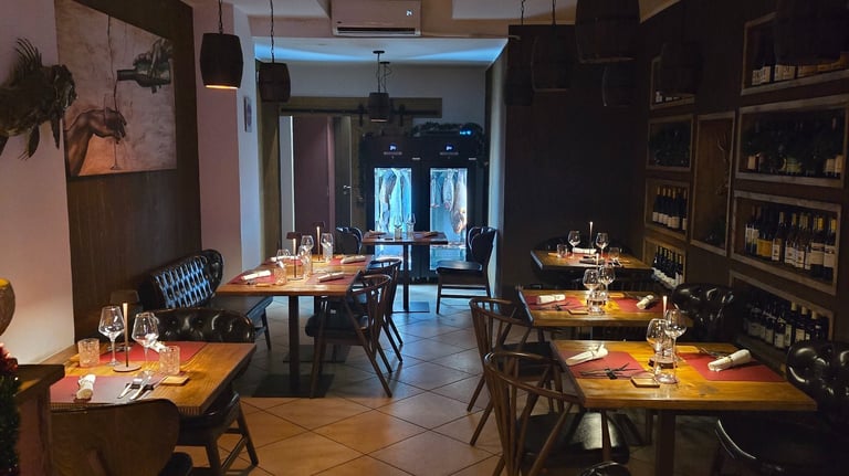 un ambiente intimo con luci soffuse e frighi di frollatura a vista